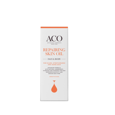 Monivaikutteinen, dermatologisesti testattu kuivaöljy kasvoille ja vartalolle. ACO Repairing Skin Oil vähentää arpien ja raskausarpien näkyvyyttä sekä estää vaikeiden raskausarpien syntymistä mm. raskauden aikana tai muusta syystä johtuvan painon nousun seurauksena. Korjaava hoitoöljy sopii myös ikääntyvälle, epätasaiselle ja kuivuuteen taipuvaiselle iholle. Sisältää luonnollisia raaka-aineita, jotka auttavat ihon luonnollisessa korjausprosessissa. Nopeasti imeytyvä öljy syväkosteuttaa ihoa ja sopii kaikille ihotyypeille sekä myös herkälle iholle.