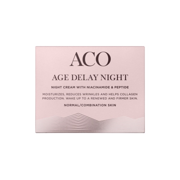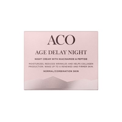 ACO AGE DELAY NIGHT on kosteuttava ja tehokas anti-age yövoide normaalille/sekaiholle. Yövoide auttaa lisäämään ihon kollageenin tuotantoa ja kimmoisuutta. Voide kosteuttaa ihoa yön aikana, jolloin iho on herättyäsi sileä ja juonteet ovat näkyvästi vähentyneet. Sopii normaalille/sekaiholle. Hellävarainen iholle. Miedosti hajustettu. Dermatologisesti testattu.