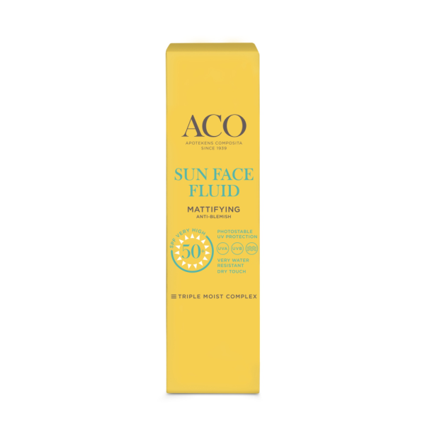 Ihon kiiltelyä vähentävä ja mattapintaa antava aurinkovoide kasvoille, normaalille ja sekaiholle. ACO Sun Face Fluid Mattifying SPF50+ ei tuki ihohuokosia ja sopii loistavasti meikin alle. Aurinkovoide sisältää ACO:n Triple Moist Complex-kosteudensitojayhdisteen, joka kosteuttaa ihoa tehokkaasti ja pitkävaikutteisesti. Lisäksi voiteen E-vitamiini toimii antioksidanttina. Suojakerroin 50+ (erittäin korkea suoja). Erittäin vedenkestävä. Hajusteeton.
