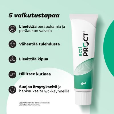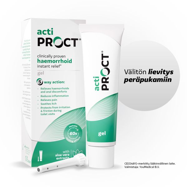 ActiProct®-geelillä on kliinisesti todistettu peräpukamavaivoja lievittävä vaikutus. Geelin on osoitettu vähentävän tehokkaasti kutinaa, ärsytystä, kipua, tulehdusta ja kirvelyä