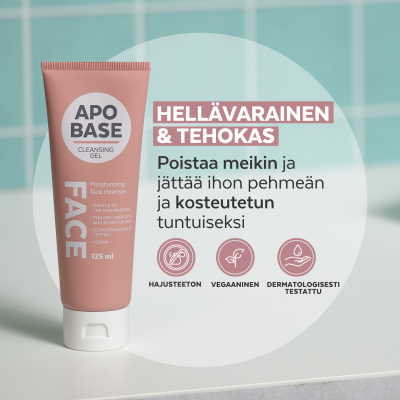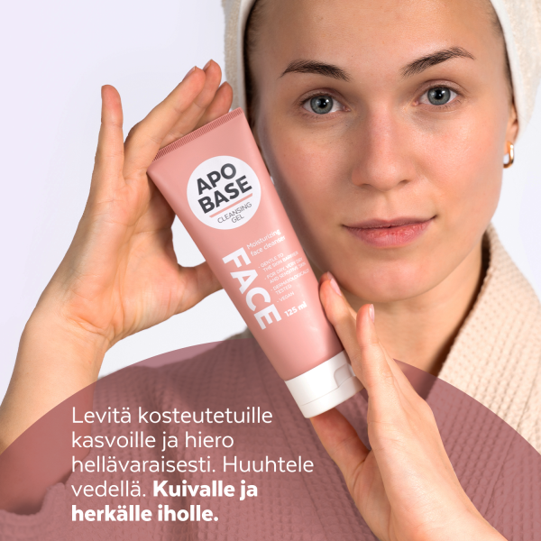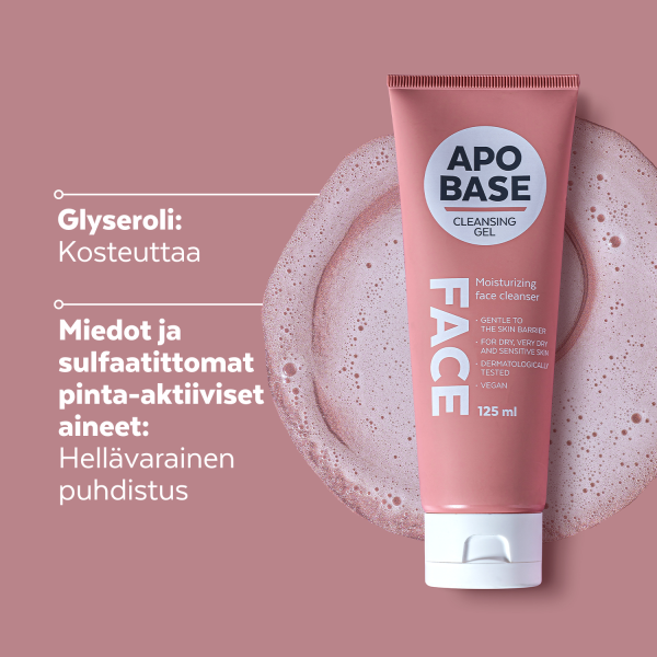 Apobase Cleansing Gel on hellävarainen ja kosteuttava puhdistusgeeli kasvoille, joka vahvistaa ihon omaa suojakerrosta ja jättää iholle pehmeän tunteen. Kosteuttava puhdistusgeeli puhdistaa kasvot hellävaraisesti ja tehokkaasti ja poistaa myös meikin. Tuote ylläpitää ihon kosteutta ja ehkäisee ihon kuivumista. Sopii kuivalle, erittäin kuivalle, herkälle ja atooppiselle iholle päivittäiseen käyttöön.
