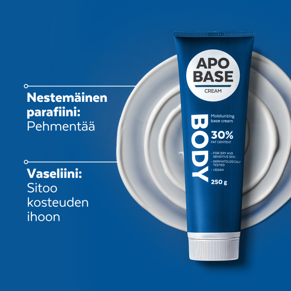 Apobase Creme on kosteuttava ja kosteuden säilyttävä perusvoide kuivan ja herkän ihon päivittäiseen hoitoon. Myös atooppisen ihon hoitoon sopiva Apobase creme on koko perheen hoitovoide, joka hoitaa kuivia käsiä sekä taive- ja vaippaihottumaa. Voide kosteuttaa, pehmentää ja hoitaa herkkää ihoa, jättämättä sille rasvaista tuntua. Hajusteeton ja lisäaineeton voide imeytyy nopeasti.