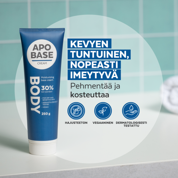 Apobase Creme on kosteuttava ja kosteuden säilyttävä perusvoide kuivan ja herkän ihon päivittäiseen hoitoon. Myös atooppisen ihon hoitoon sopiva Apobase creme on koko perheen hoitovoide, joka hoitaa kuivia käsiä sekä taive- ja vaippaihottumaa. Voide kosteuttaa, pehmentää ja hoitaa herkkää ihoa, jättämättä sille rasvaista tuntua. Hajusteeton ja lisäaineeton voide imeytyy nopeasti.