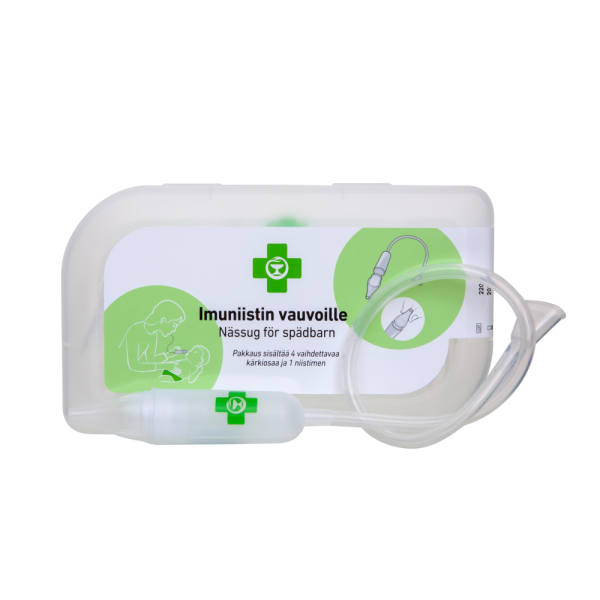 Lääkkeetön apu imeväisikäisille avaamaan tukkoista nenää nenäeritettä poistamalla. Laitteen avulla nenäeritteen voi imeä turvallisesti, hellävaraisesti ja hygieenisesti.