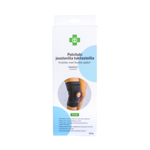 Kohtalaisen tuen antava yhden koon puuvillalla vuorattu neopreenituki, jossa neljä sivutukilastaa. Avoin takaosa ja vakauttava pehmusterengas polvilumpion ympärillä helpottavat käyttöä liikunnan aikana. Sopii sekä oikeaan että vasempaan polveen.
