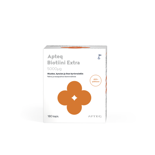 Apteq Biotiini Extra on hiusten, kynsien ja ihon hyvinvointiin suunniteltu vahva ja monipuolinen biotiinivalmiste. Biotiini Extra on Suomessa kehitetty vitamiini-, aminohappo- ja kasvisuuteyhdistelmä.