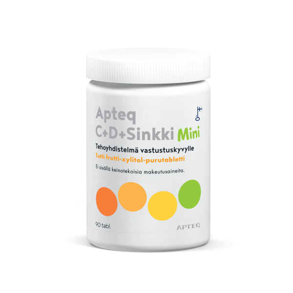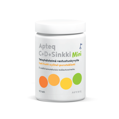 Apteq C+D+Sinkki Mini on lapsille suunnattu tehoyhdistelmä vastustuskyvylle! Hammasystävällinen ja maukas tutti frutti-xylitol-purutabletti.