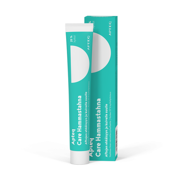 Apteq plus hammastahna on kehitetty yhdessä suunhoidon ammattilaisten kanssa vastaamaan erityisesti kuiva- ja herkkäsuisten tarpeita. Hammastahnassa on erittäin korkea 25 % ksylitolipitoisuus ja siinä on ainutlaatuinen hellävarainen vaahtoamismekanismi ilman limakalvoja ärsyttäviä pesuaineita, kuten natriumlauryylisulfaattia. Suuri ksylitolipitoisuus estää tehokkaasti kariesta aiheuttavien mutans streptokokki -bakteerien toimintaa, lisää syljen eritystä ja estää syljen pH:n laskua.