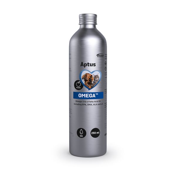 Aptus Omega öljy on omega-3- ja omega-6-rasvahappoja sisältävä täydennysrehuvalmiste koirille ja kissoille.