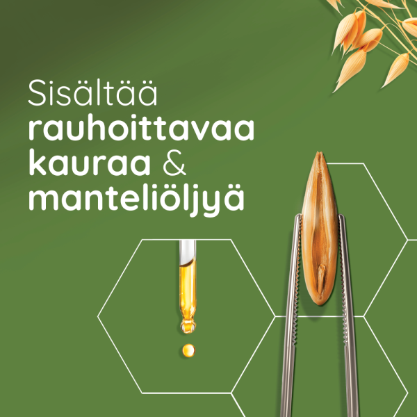 Aveeno® Daily Moisturising Creamy Oil 300 ml, miedon mantelin tuoksuinen öljyvoide, joka auttaa rauhoittamaan ihoa ja kosteuttaa 24 tuntia. Kliinisesti todistetusti ravitsee, pehmentää ja silottaa ihoa. Sisältää rauhoittavaa kauraa ja manteliöljyä. Parantaa ihon luonnollista tasapainoa tehden siitä terveen näköisen. Tahmaamaton koostumus. Sopii normaalille, kuivalle ja herkälle vartalon sekä kasvojen iholle.