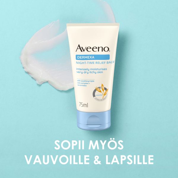 Aveeno® Dermexa Fast & Long Lasting Balm 75 ml, hajustamaton hoitovoide erittäin kuivalle iholle, sopii myös ihottumaan taipuvaiselle iholle. Kosteuttaa tehokkaasti auttaen vähentämään kutinaa välittömästi ja jopa kuuden tunnin ajan. Prebioottisen kolmoiskaurayhdisteen (kaurajauhe + kaurauute + kauraöljy) (in vitro) sekä keramideja sisältävä voide auttaa säilyttämään ihon luonnollisen mikrobiomin tasapainon ja vahvistaa ihon suojamuuria, tehden ihosta terveen näköisen ja kestävämmän ensimmäisestä päivästä lähtien. Sopii vauvoille, lapsille ja aikuisille.