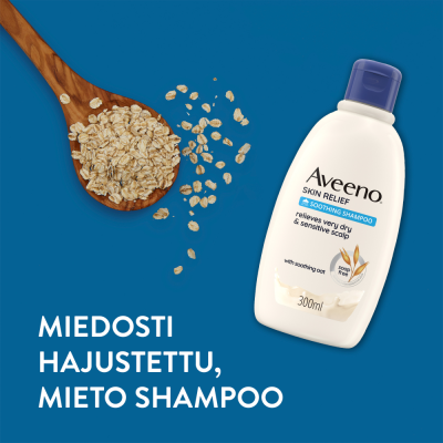 Aveeno® Skin Relief Soothing Shampoo 300 ml, miedosti hajustettu shampoo puhdistaa hiukset hellävaraisesti kuivattamatta niitä ja lievittää erittäin kuivan ja herkän hiuspohjan kutinaa. Rauhoittavaa kauraa sisältävä mieto koostumus tukee ihon luonnollista tasapainoa, tehden hiuspohjan miellyttävän tuntuiseksi. Sopii säännölliseen käyttöön, myös ohuille ja hauraille hiuksille. Ei sisällä saippuaa. Dermatologisesti testattu.