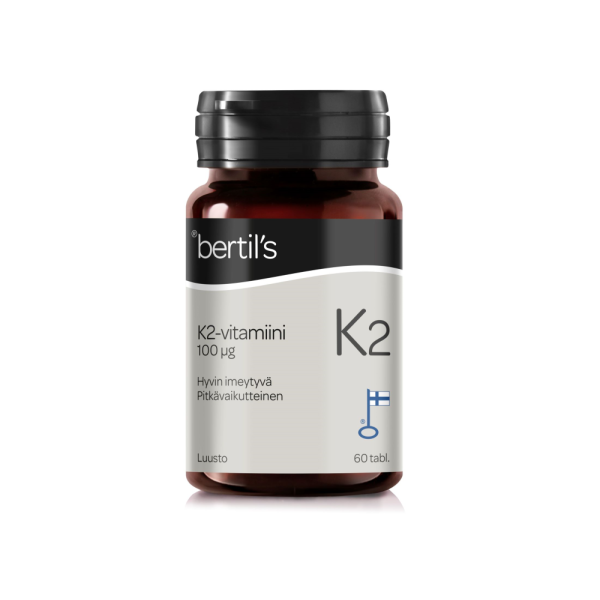 bertil’s K2-vitamiini sisältää K2-vitamiinia luonnollisessa muodossaan, minkä vuoksi se on erityisen hyvin elimistön hyödynnettävissä. Lisäksi patentoitu K2VITAL®DELTA -K2-vitamiini on pitkävaikutteinen, joten tuotteesta saa maksimaalisen hyödyn. K2-vitamiinin tärkeä tehtävä on ohjata kalsiumia verenkierrosta luustoon. Näin se osallistuu myös verenkiertoelimistön hyvinvointiin. bertil´s K2-vitamiini on erinomainen tuki luustolle yhdessä kalsium- ja D-vitamiinivalmisteiden kanssa käytettäväksi.