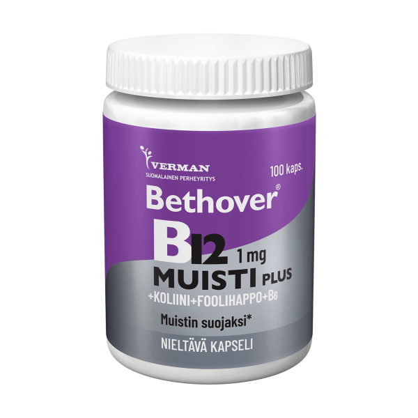 Se sisältää B12-vitamiinia, foolihappoa ja B6-vitamiinia – tärkeitä ravintoaineita, jotka edistävät aivojen normaalia toimintaa ja tukevat kognitiivista suorituskykyä. Lisäksi Bethover B12 Muisti Plus sisältää koliinia, joka on elimistölle välttämätön ja kliinisesti tutkittu ravintoaine. Koliini on vitamiinin kaltainen yhdiste, jota löytyy kaikkialta solukalvoista. Se toimii rakennusaineena välittäjäaineelle, jota tarvitaan solujen väliseen yhteydenpitoon. *B12-vitamiini ja folaatti edistävät normaaleja psykologisia toimintoja.