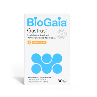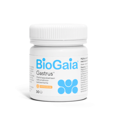 BioGaia Gastrus -maitohappobakteerivalmiste on vahva, kahden ihmiselle luontaisen Lactobacillus reuteri -maitohappobakteerikannan yhdistelmä. Se sisältää patentoitua Lactobacillus reuteri Gastrus® (L. reuteri DSM 17938 ja L. reuteri ATCC PTA 6475*) -maitohappobakteerikantaa. L. reuteri Gastrus on kliinisesti tutkittu. Annostus 1-2 purutablettia päivässä. Mandariininmakuinen. Gluteeniton, maidoton, ja laktoositon. Sopii vegaaneille. Ravintolisä.