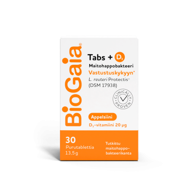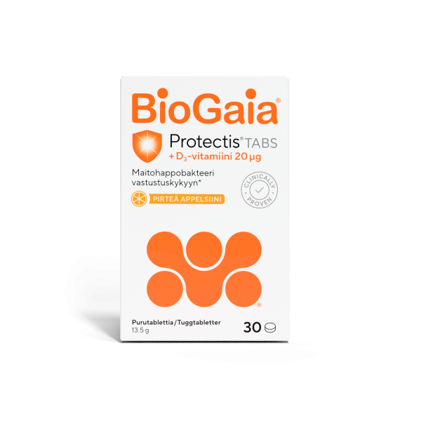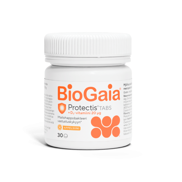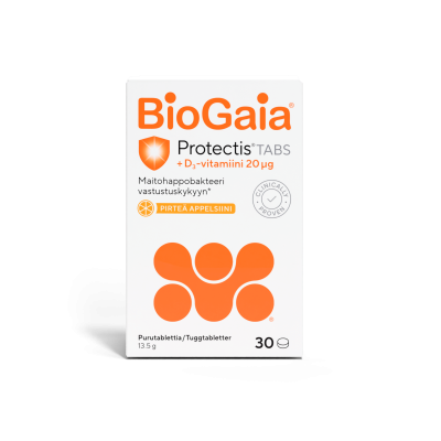 BioGaia Protectis TABS+D3 -maitohappobakteerivalmiste sisältää alkuperäistä, tutkittua ja patentoitua Lactobacillus reuteri Protectis® (L. reuteri DSM 17938) -maitohappobakteerikantaa, josta on tehty yli 200 kliinistä tutkimusta sekä D3-vitamiinia vastustuskyvyn tueksi*. Pirteän appelsiininmakuiset purutabletit sopivat kaikenikäisille joko päivittäiseen käyttöön tai kuurina. Annostus on 1 purutabletti päivässä. Maidoton, gluteeniton, laktoositon ja hiivaton. Ravintolisä. *D-vitamiini edistää immuunijärjestelmän normaalia toimintaa.