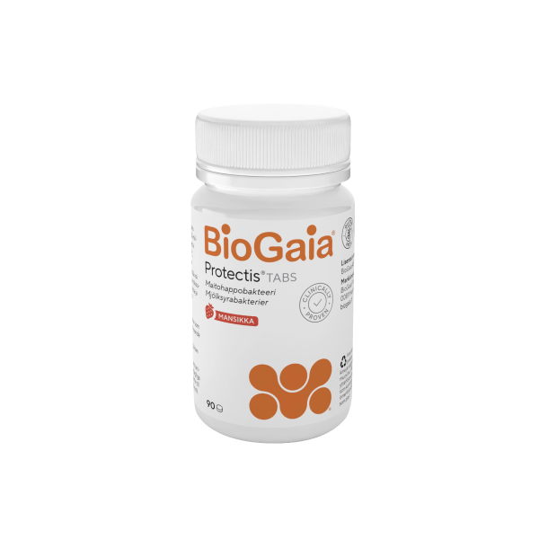 BioGaia Protectis TABS on maitohappobakteerivalmiste, joka sisältää alkuperäistä, tutkittua ja patentoitua Lactobacillus reuteri Protectis® (L. reuteri DSM 17938) -maitohappobakteerikantaa, josta on tehty yli 200 kliinistä tutkimusta. Mansikanmakuiset purutabletit sopivat kaikenikäisille joko päivittäiseen käyttöön tai kuurina. Annostus on 1 purutabletti päivässä. Maidoton, gluteeniton, laktoositon. Ei sisällä eläinperäisiä aineita. Ravintolisä.