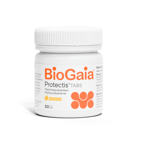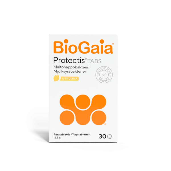 BioGaia Protectis TABS on maitohappobakteerivalmiste, joka sisältää alkuperäistä, tutkittua ja patentoitua Lactobacillus reuteri Protectis® (L. reuteri DSM 17938) -maitohappobakteerikantaa, josta on tehty yli 200 kliinistä tutkimusta. Raikkaan sitruunanmakuiset purutabletit sopivat kaikenikäisille joko päivittäiseen käyttöön tai kuurina. Annostus on 1 purutabletti päivässä. Maidoton, gluteeniton, laktoositon ja hiivaton. Ei sisällä eläinperäisiä aineita. Ravintolisä.