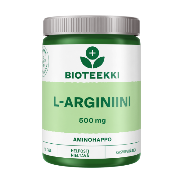 Bioteekki L-arginiini on kotimainen, L-arginiini-aminohappoa sisältävä ravintolisä. Arginiini on kehon useita toimintoja tukeva aminohappo. Typpioksidi on arginiinin aineenvaihduntatuote. Helposti nieltävä tabletti, joka sopii myös vegaaneille. Tuote on laktoositon, gluteeniton ja hiivaton.