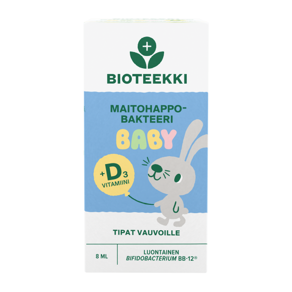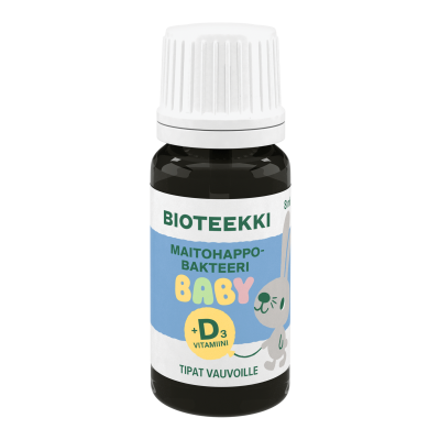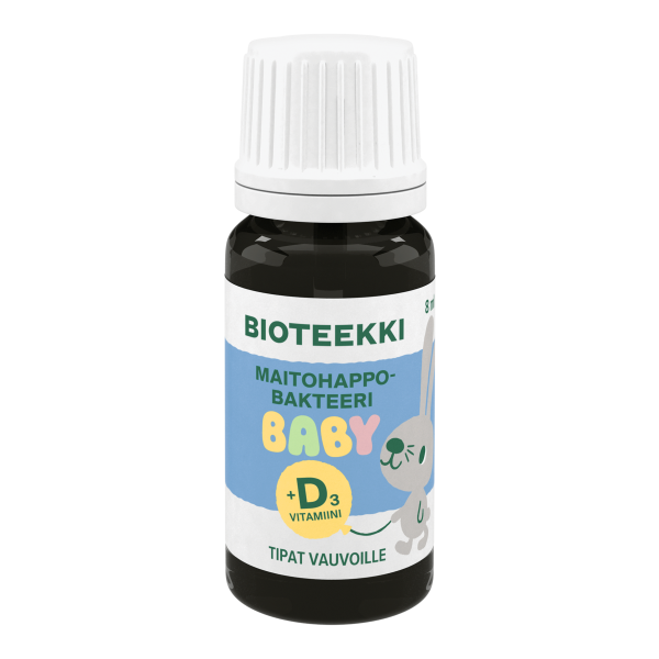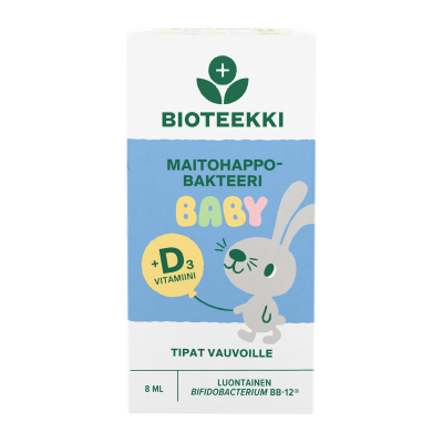 Bioteekki Maitohappobakteeri Baby +D3 Tipat (entinen BalanticPro Baby) on Suomessa valmistettu maitohappobakteeritippa vastasyntyneille ja vauvaikäisäisille. Bioteekki Maitohappobakteeri Babyn sisältämä Bifidobacterium BB-12® on vauvalle luontainen ja kliinisesti tutkittu maitohappobakteeri. Tipat sisältävät 1 miljardi elävää Bifidobacterium BB-12® -bakteeria / 6 tippaa, ja sopivat päivittäiseen käyttöön tai kuurina vastasyntyneille ja vanhemmille. Sisältää myös hyvin imeytyvää D3-vitamiinia. Annostus kuusi tippaa päivässä, riittoisa 8 ml pakkaus sisältää vähintään 21 päiväannosta. Bioteekki Maitohappobakteeri Baby -tipat säilyvät huoneenlämmössä, avattuna 4 viikkoa. Ravistettava ennen käyttöä. Tuote on gluteeniton, liivatteeton ja soijaton. Tuote saattaa sisältää jäämiä maidosta.