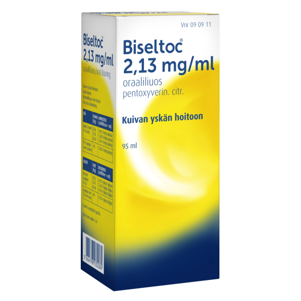 Biseltoc oraaliliuos vähentää yskänkeskuksen liiallista stimulaatiota ja normalisoi siten yskänrefleksiä tilapäisen kuivan yskän hoidossa. Jos yskä jatkuu yli viikon tai oireet pahentuvat, ota yhteys lääkäriin.