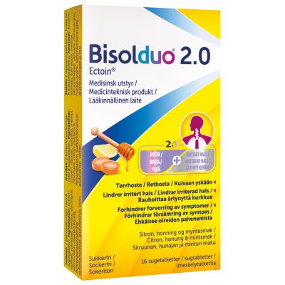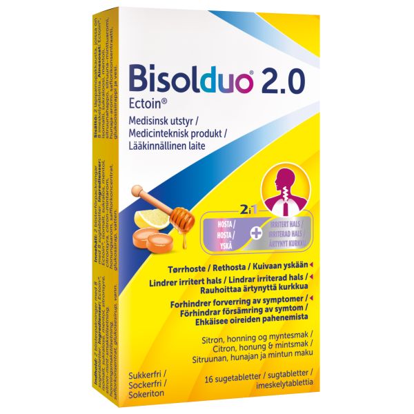 Bisolduo 2.0-imeskelytabletit lievittävät flunssan ensioireita, kuten äänen käheyttä, kuivaa yskää ja nielun ärsytystä, ja ehkäisevät oireiden pahenemista. Sen vuoksi on suositeltavaa aloittaa imeskelytablettien käyttö heti flunssan ensimmäisten merkkien ilmaantuessa. Bisolduo 2.0-imeskelytableteissa on miellyttävä sitruunan, hunajan ja mintun maku.