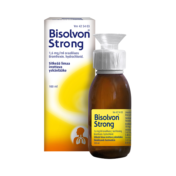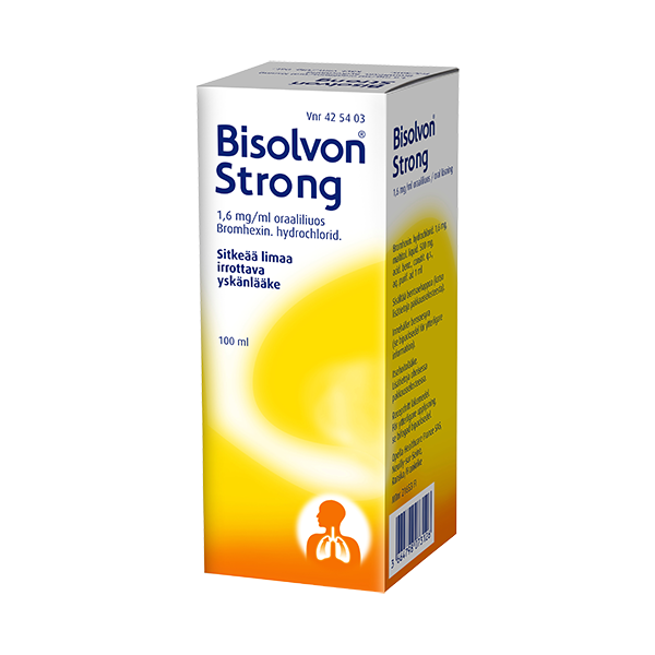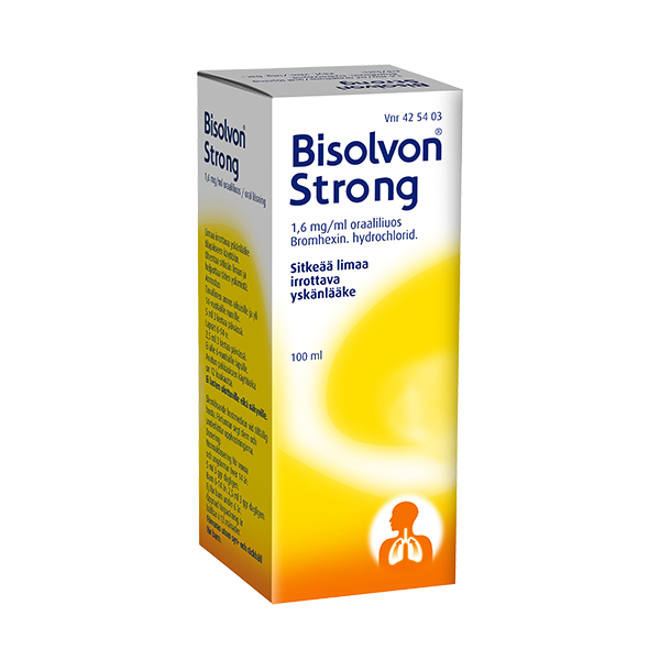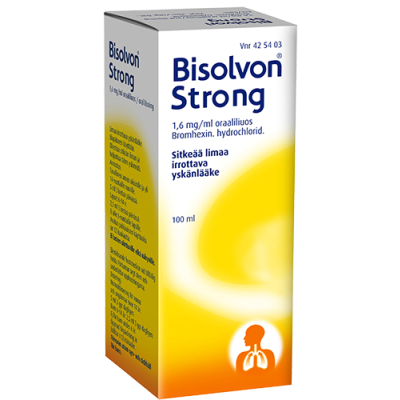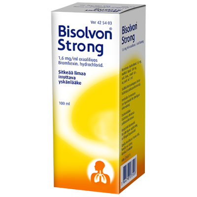BISOLVON Strong on limaa irrottava yskänlääke tilapäiseen käyttöön. Valmisteen vaikuttava aine bromiheksiini muuttaa sitkeän liman juoksevammaksi ja helpottaa siten sen poisyskimistä. Pitkäaikaiseen käyttöön ja alle 6-vuotiaille lapsille vain lääkärin määräyksestä.
