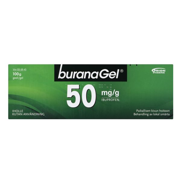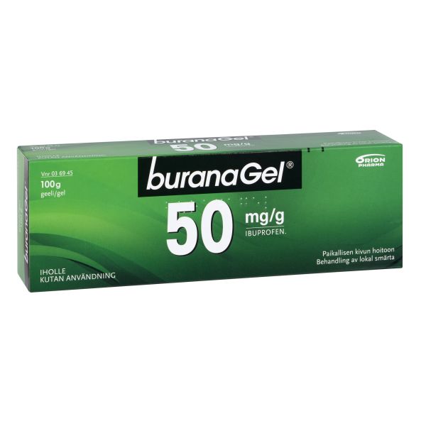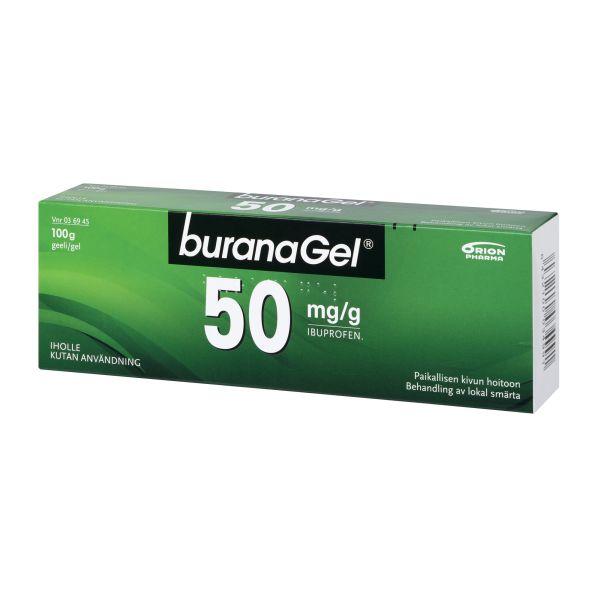 Buranagel 50 mg/g geeli paikallisen lihas-ja nivelkivun oireenmukaiseen hoitoon venähdyksissä, nyrjähdyksissä tai ruhjeissa, jotka johtuvat hyvänlaatuisista vammoista. Vaikuttava aine ibuprofeeni. Aikuisille ja yli 14-vuotiaille enintään 7 vuorokauden ajan. Ei raskauden viimeisellä kolmanneksella eikä rikkoutuneelle iholle. Varo geelin joutumista silmiin tai limakalvoille. Neuvottele käytöstä lääkärin kanssa, jos oireet pitkittyvät, jos olet yliherkkä jollekin särkylääkkeelle, sairastat maha- tai pohjukaissuolihaavaa tai sinulla on verenvuototaipumus. Tutustu huolellisesti pakkausselosteeseen. Pakkauskoot 50 g ja 100 g.