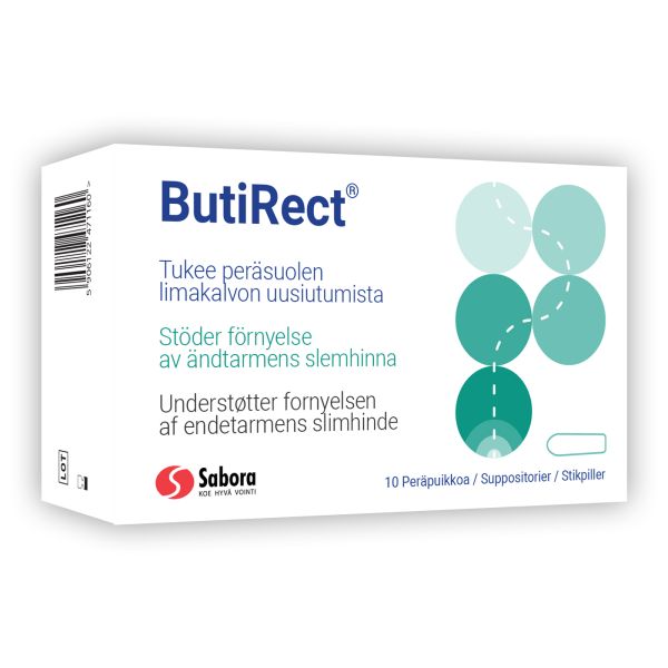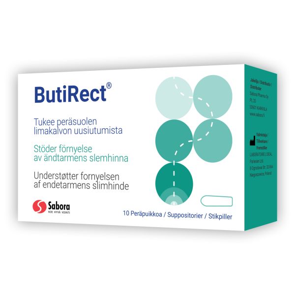Nopeavaikutteinen ButiRect peräpuikko tukee peräsuolen limakalvon uusiutumista ja lievittää ulostuskipua, kun kyseessä on tulehdus peräsuolessa, peräsuolen epiteelivauriot ja halkeamat, peräpukamat tai peräsuolen leikkauksen tai sädehoidon jälkeinen tila. ButiRect peräpuikon sisältämät natriumbutyraatti ja natriumalginaatti muodostavat kosteuttavan ja suojaavan kalvon peräsuoleen, joka edistää peräsuolen limakalvon fysiologisen tilan palautumista. Tarvittaessa suositellaan käyttämään pinnallista puudutetta ennen peräpuikon asettamista. Aikuisille. CE 2274 Lääkinnällinen laite. Valmistaja LABORATOIRE L'IDEAL Pariesien Ltd.