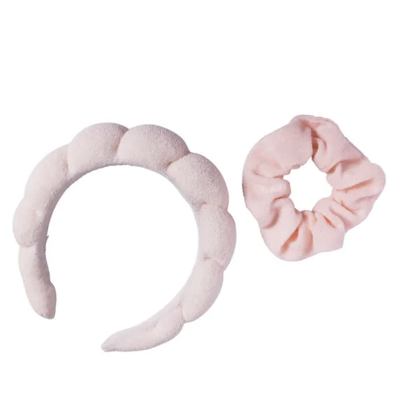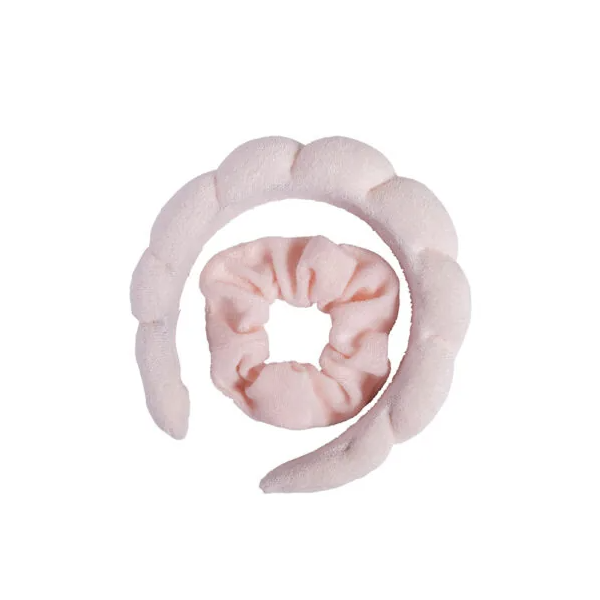 Ihana vaaleanpunainen froteinen ihonhoitopanta ja hiusdonitsi -setti.