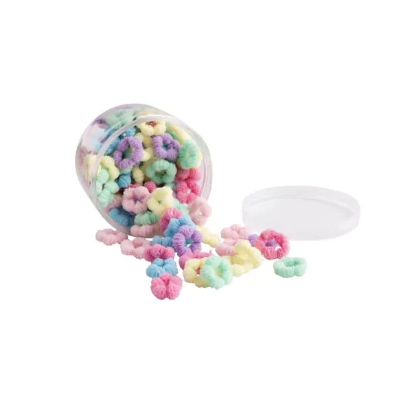 Rasia sisältää 100 kpl eri värisiä, kukanmuotoisia pieniä pehmeitä hiuslenkkejä.