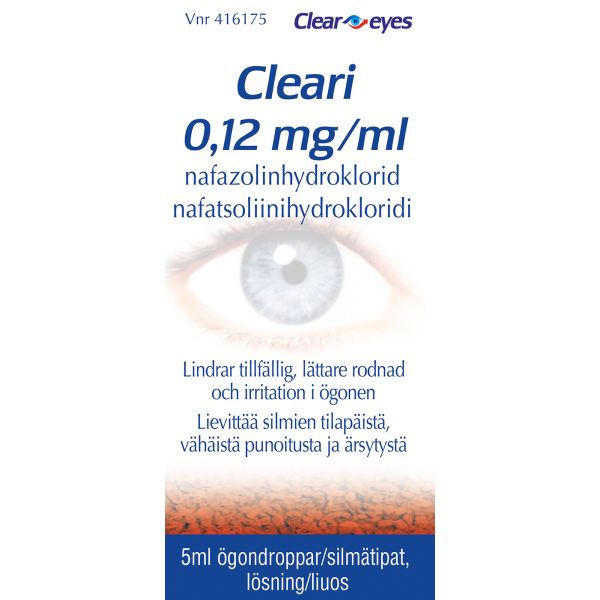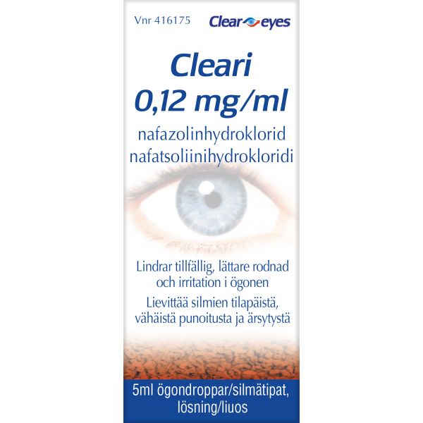 Cleari silmätippaliuos on tarkoitettu aikuisille ja vähintään 12-vuotiaille lapsille tilapäisesti lievittämään silmien vähäistä punoitusta ja ärsytystä. Valmisteen vaikuttava aine nafatsoliinihydrokloridi, joka kuuluu paikallisesti verisuonia supistavien lääkeaineiden ryhmään.