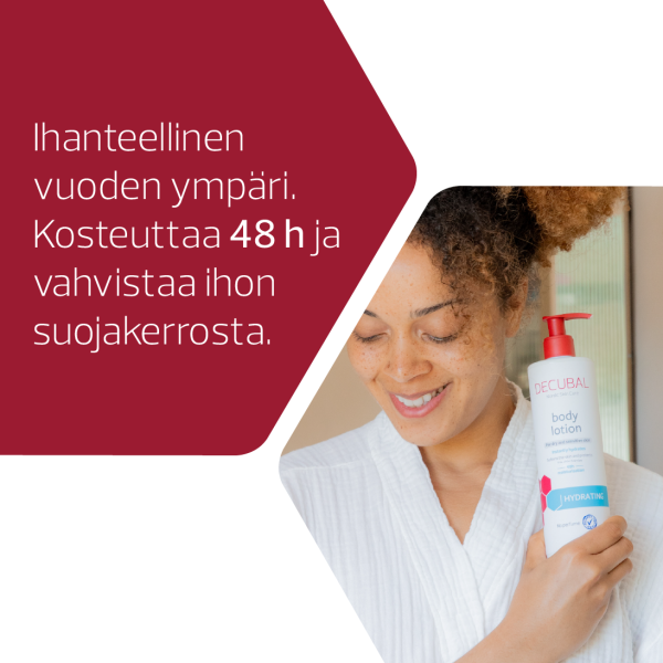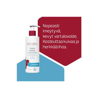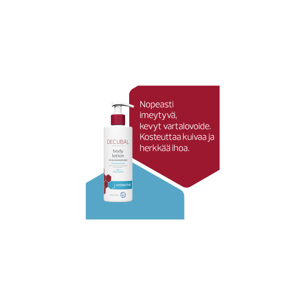 Decubal Hydrating Body Lotion on kevyt vartalovoide, joka imeytyy nopeasti, syväkosteuttaa 48 tunnin ajan ja auttaa suojaamaan ihon luonnollista suojakerrosta.