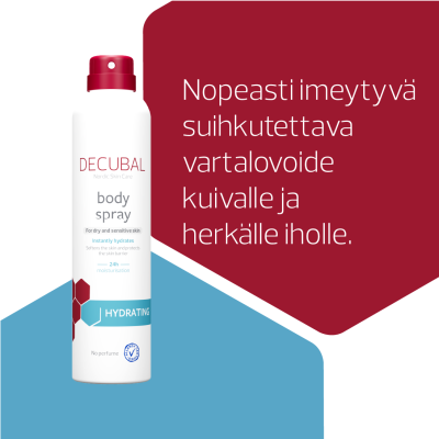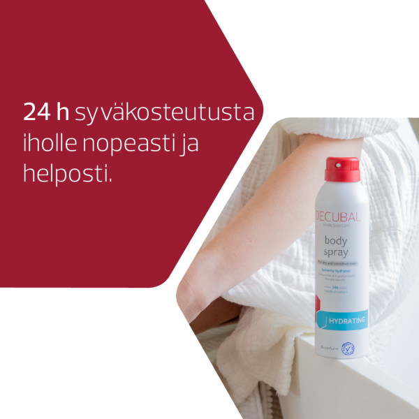Nopeasti imeytyvä iholle suihkutettava Decubal Hydrating Body Spray syväkosteuttaa 24 tunnin ajan ja auttaa suojaamaan ihon luonnollista suojakerrosta.