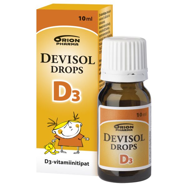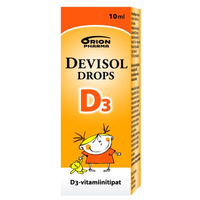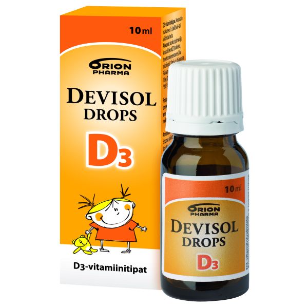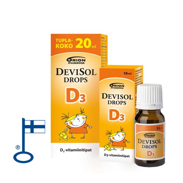DeviSol Drops on D3-vitamiinia sisältävä öljypohjainen tippavalmiste, joka soveltuu päivittäisen D-vitamiinin saannin varmistamiseen vauvaiästä lähtien. Helppo annostella lusikalla tai sekoittaa ruokaan tai juomaan. Täysin makuaineettomat DeviSol-tipat voi sekoittaa joko kuumaan tai kylmään ruokaan tai juomaan. Ei sisällä säilöntä-, väri- tai aromiaineita. Säilyy huoneenlämmössä myös avaamisen jälkeen. Suositeltu päiväannos on 1-5 tippaa eli 2-10 mikrogrammaa.