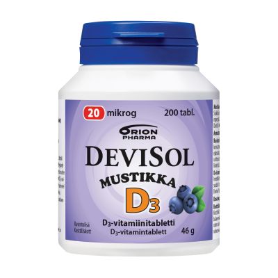 Devisol Mustikka 20 mikrog on aidon mustikan makuinen D-vitamiini puru-/imeskelytabletti. Makeutettu ksylitolilla ja sorbitolilla. Sisältää hyvin imeytyvää D3-vitamiinia. Saatavilla 200 tabl. pakkauksissa.