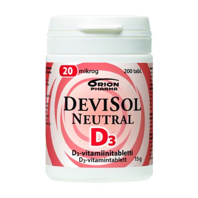 DeviSol Neutral on erittäin pienikokoinen, nieltävä D-vitamiinitabletti. DeviSol Neutral ei sisällä lainkaan sokeria, makeutus- tai aromiaineita. Erinomainen vaihtoehto puru/imeskelytabletille ja sopii erityisesti niille, jotka välttelevät makeutus ja/tai aromiaineita. Erittäin pienikokoinen tabletti on lapsenkin helppo niellä. DeviSol Neutral -valmiste sopii mm. fodmap-ruokavaliota noudattaville ja sitä voi kokeilla, jos aromianieita sisältävät D-vitamiinivalmisteet aiheuttavat yliherkkyysoireita. Laktoositon (maidoton), gluteeniton, hiivaton, sokeriton. Ei sisällä soijaa tai liivatetta.