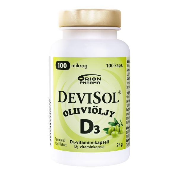 Nieltävä D-vitamiiniöljykapseli. DeviSol Oliiviöljy sisältää hyvin imeytyvää D3-vitamiinia ja korkealaatuista ekstra-neitsytoliiviöljyä samassa, helposti nieltävässä kapselissa. Yksi kapseli sisältää 100 mikrogrammaa D-vitamiinia.