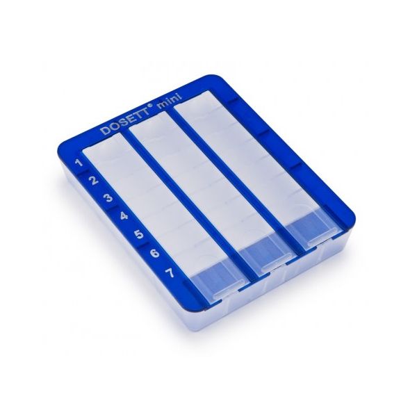 Pienikokoinen lääkennostelija lääkkeiden tilapäiseen säilytykseen ja helpottamaan lääkkeitten annostelua sekä lääkkeen ottamista oikeaan aikaan. Annostelijassa on seitsemän päiväkohtaista 3 osaan jaettua lokerikkoa. Solvetuu hyvin käyttöön silloin, kun päivittäislääkkeitten määrä on pieni. Koko 80x100x18 mm.