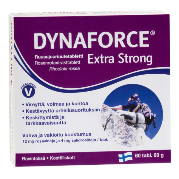 Dynaforce® Extra Strong tabletit sisältävät standardoitua ruusujuuren juuriuutetta, jonka tärkeinä vaikuttavina ainesosina ovat rosavinit ja salidrosidit. Yhdessä tabletissa on 12 mg rosavineja ja 4 mg salidrosideja.