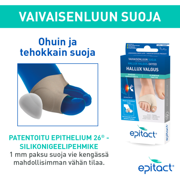 - Jalkaterapeuttien patentoima Epithelium 26® on silikonigeeli, jonka painetta jakavat ominaisuudet muistuttavat ihonalaiskudoksen ominaisuuksia. Ohut Epithelium 26® -pehmike vaivaisenluun vieressä suojaa vaivaisenluuta ja lievittää tehokkaasti hankauksesta johtuvaa kipua aiheuttamatta kuitenkaan lisäpainetta. Nämä yksinkertaiset suojat eivät korjaa vaivaisenluuta.