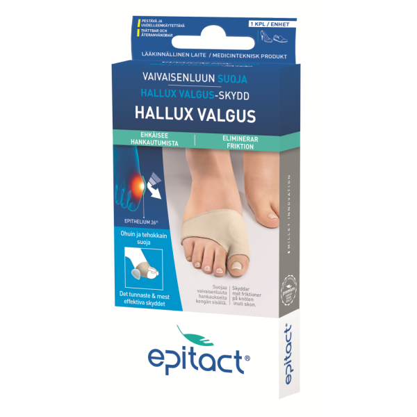 VINKKI! Jos isovarvasta pystyy yhä liikuttamaan, suosittelemme joustavan, päiväkäyttöön tarkoitetun EPITACT®-oikaisijan käyttämistä vaivaisenluun hoitoon. Se korjaa asentopoikkeamaa, rajoittaa vaivaisenluun etenemistä, lievittää nivelkipua ja estää vaivaisenluun hankautumista.
