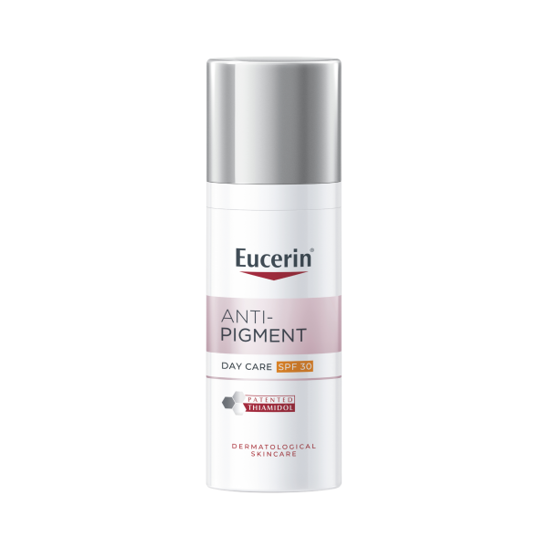Eucerin Anti-Pigment Day SPF 30 -päivävoide sisältää Thiamidolia, patentoitua ja tehokasta ainesosaa, joka vaikuttaa hyperpigmentaation syntymekanismiin ja jonka on kliinisissä tutkimuksissa todistettu häivyttävän pigmenttimuutoksia, sekä ehkäisevän uusien tummentumien muodostumista.