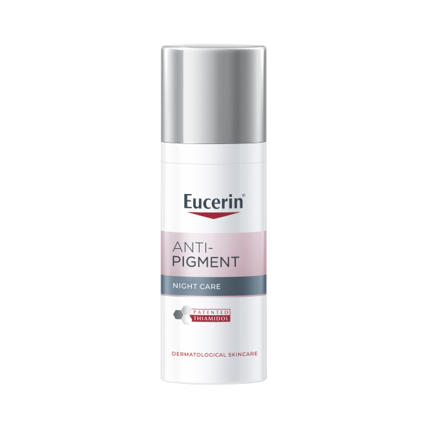 Eucerin Anti-Pigment Night -yövoide sisältää Thiamidolia, patentoitua ja tehokasta ainesosaa, joka vaikuttaa hyperpigmentaation syntymekanismiin ja jonka on kliinisissä tutkimuksissa todistettu häivyttävän pigmenttimuutoksia, sekä ehkäisevän uusien tummien läiskien muodostumista. Ensimmäiset tulokset näkyvät jo kahden viikon jälkeen, ja säännöllisessä käytössä saavutetaan vielä merkittävämpiä tuloksia.