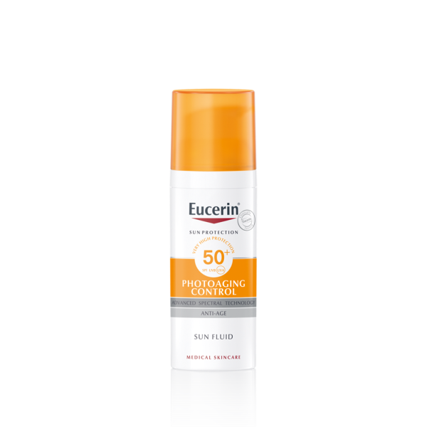 Eucerin Photoaging Sun Fluid SPF50+ on korkealuokkainen aurinkosuoja kasvoille. Sen sisältämä Eucerin Advanced Spectral -teknologia tarjoaa erittäin korkean aurinkosuojakertoimen UVA- ja UVB-säteilyä vastaan sekä suojaa ihoa korkeaenergiseltä näkyvältä valolta (HEVIS). Kattava aurinkosuoja tukee ihon omaa DNA:n korjausmekanismia ja voiteen sisältämä hyaluronihappo hidastaa ikääntymisen merkkejä.
