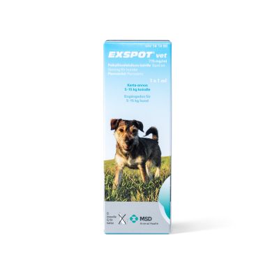 Exspot vet paikallisvaleluliuos on tarkoitettu puutiaisten, täiden ja kirppujen häätöön ja torjuntaan yli 5 kiloa painavilla koirilla.
