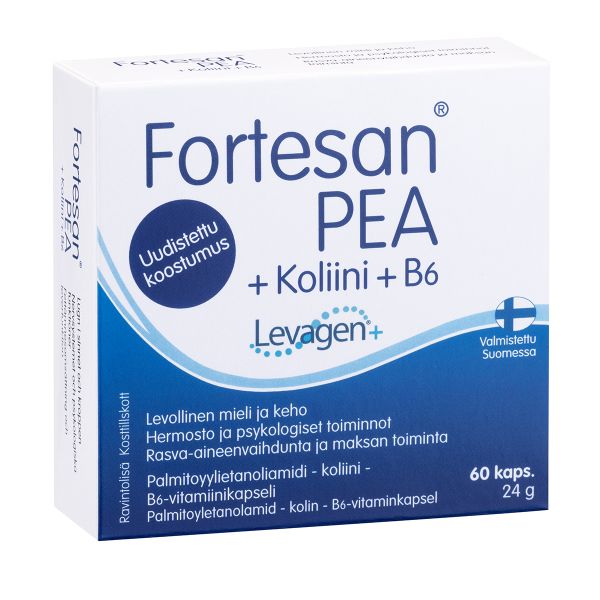 Fortesan® PEA + Koliini + B6 -ravintolisä sisältää patentoitua Levagen®+ palmitoyylietanoliamidia sekä sen vaikutusta täydentäviä koliinia ja B6-vitamiinia. Palmitoyylietanoliamidi eli PEA on rasvahappoamidi, jota keho tuottaa itse esimerkiksi urheillessa, tukien samalla suorituksesta palautumista. Se myös rentouttaa ja vaikuttaa positiivisesti unen laatuun.
