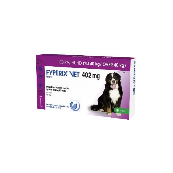 Fyperix vet 67/134/268/402 mg paikallisvaleluliuos on tarkoitettu koiran kirppu-, väive- ja puutiaistartuntojen hoitoon.