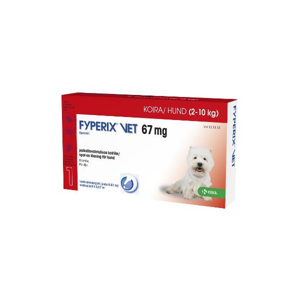 Fyperix vet 67/134/268/402 mg paikallisvaleluliuos on tarkoitettu koiran kirppu-, väive- ja puutiaistartuntojen hoitoon.
