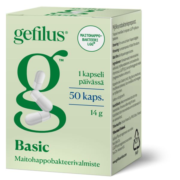 Gefilus Basic kapselit sisältävät maailman tutkituinta Lactobacillus rhamnosus GG maitohappobakteeria. Ravintolisä. Gefilus-kapselit ovat gluteenittomia ja laktoosittomia.